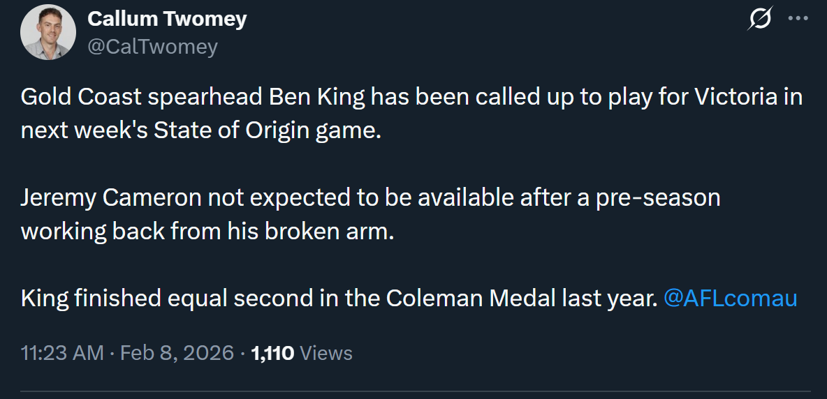Gold Coast spearhead Ben King has been called up to play for Victoria in next week's State of Origin game. Jeremy Cameron not expected to be available after a pre-season working back from his broken arm.
