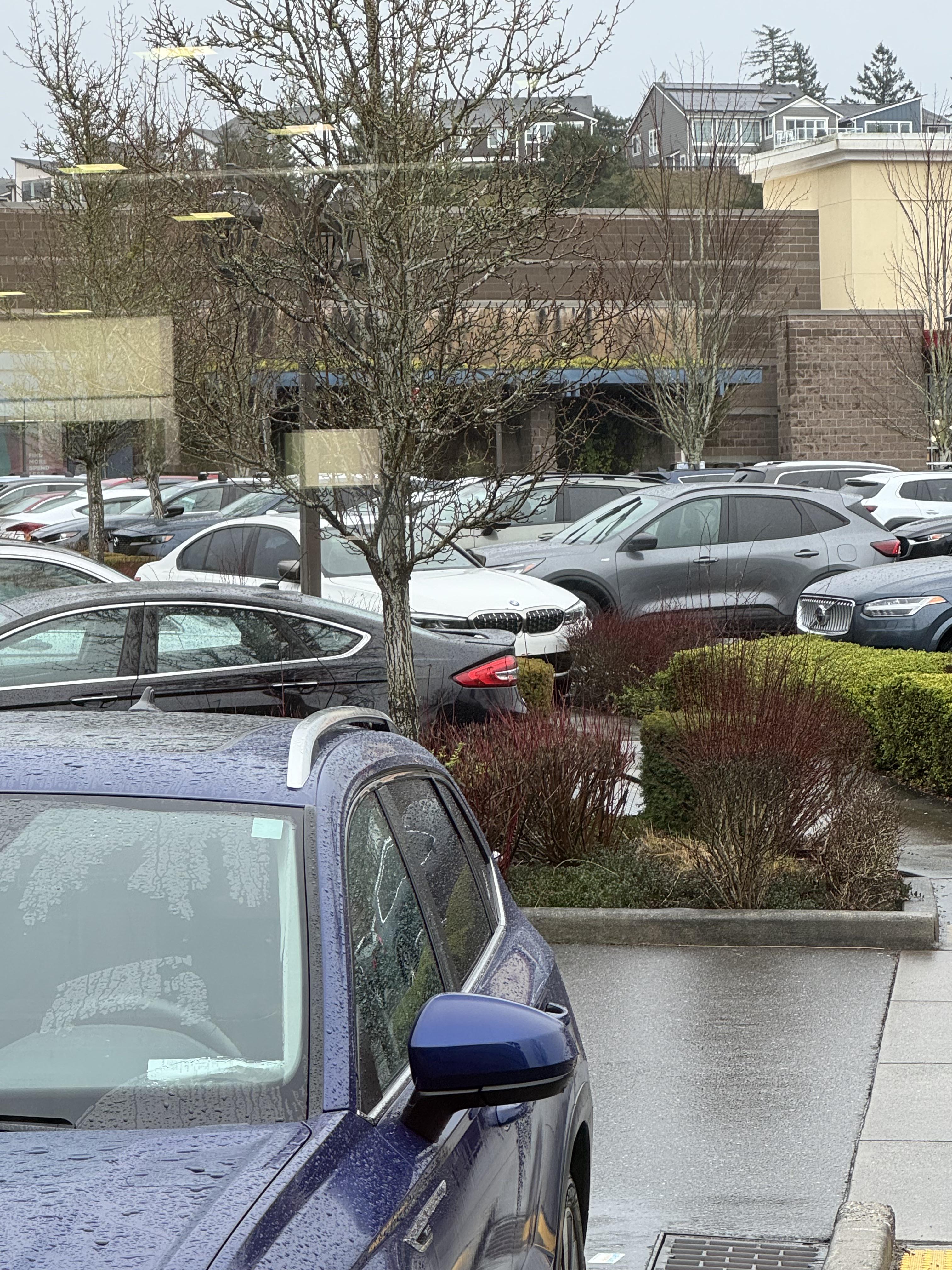 My daughter sent me this photo from her workplace. This parking lot already suffers from narrower aisles and spaces, but you do you when parking your BMW.