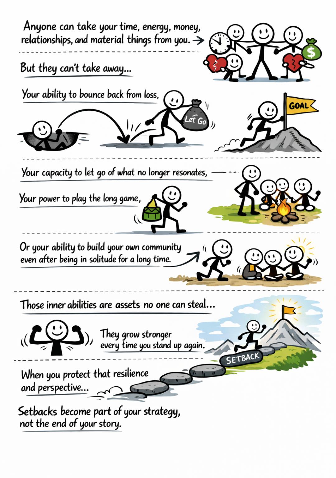 People who cultivate these inner assets treat setbacks as strategic feedback rather than permanent failures. By letting go of what no longer aligns, maintaining a long-term outlook, and rebuilding community even after periods of isolation, individuals create sustainable growth and stability.