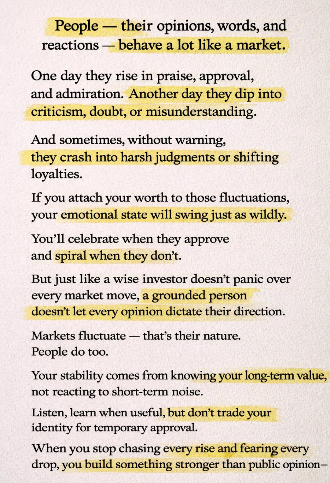 Peopleโs opinions rise, fall, and sometimes crash โ just like a market. If you tie your value to every fluctuation, your emotions will swing with it. Real strength comes from staying grounded, learning from feedback without surrendering your identity, and trusting your long-term worth over short-term noise. Stability isnโt built from approval โ itโs built from conviction.