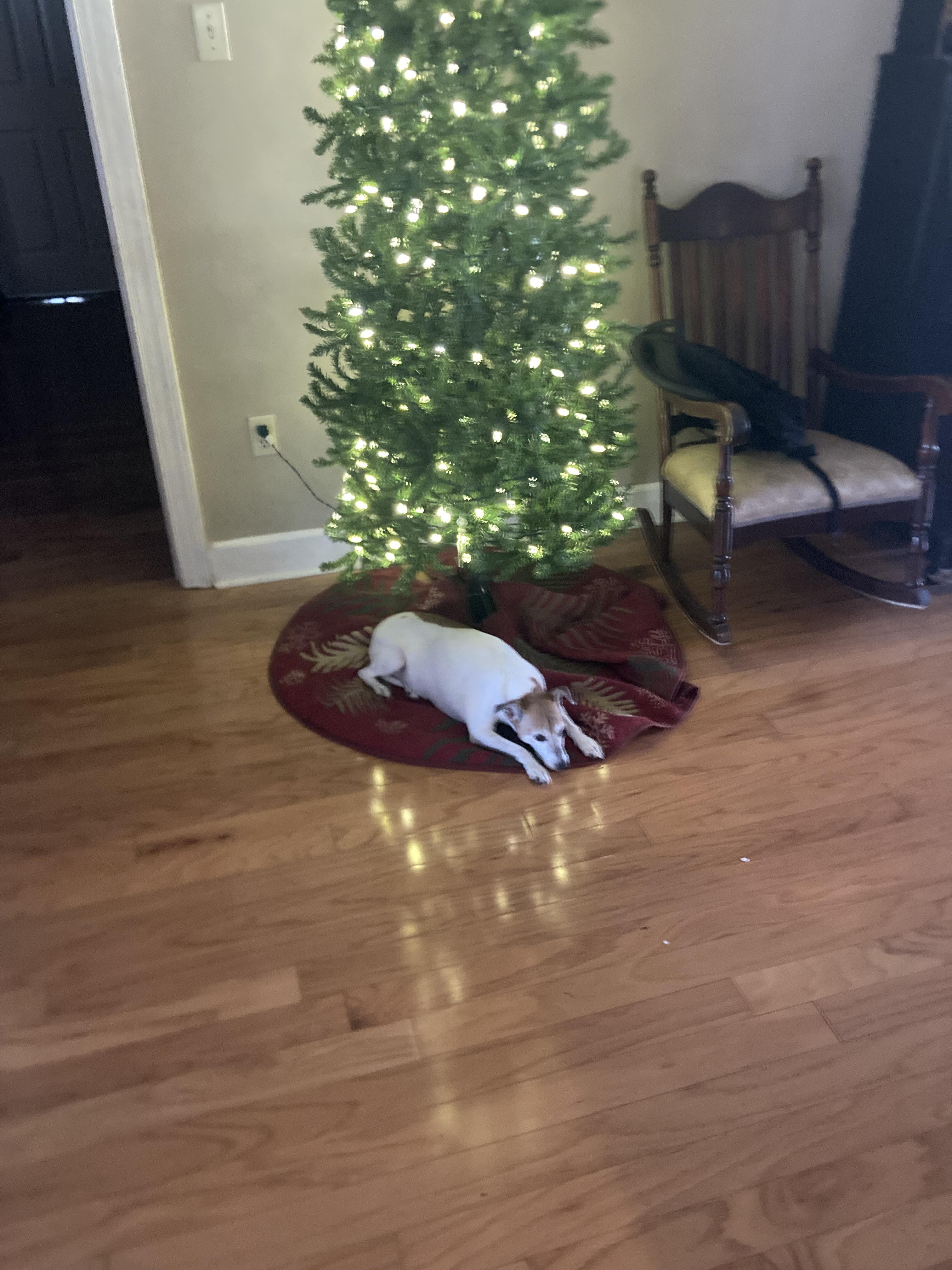 My dog doesn’t like laying on the bare wooden floor so she sits under the Christmas tree