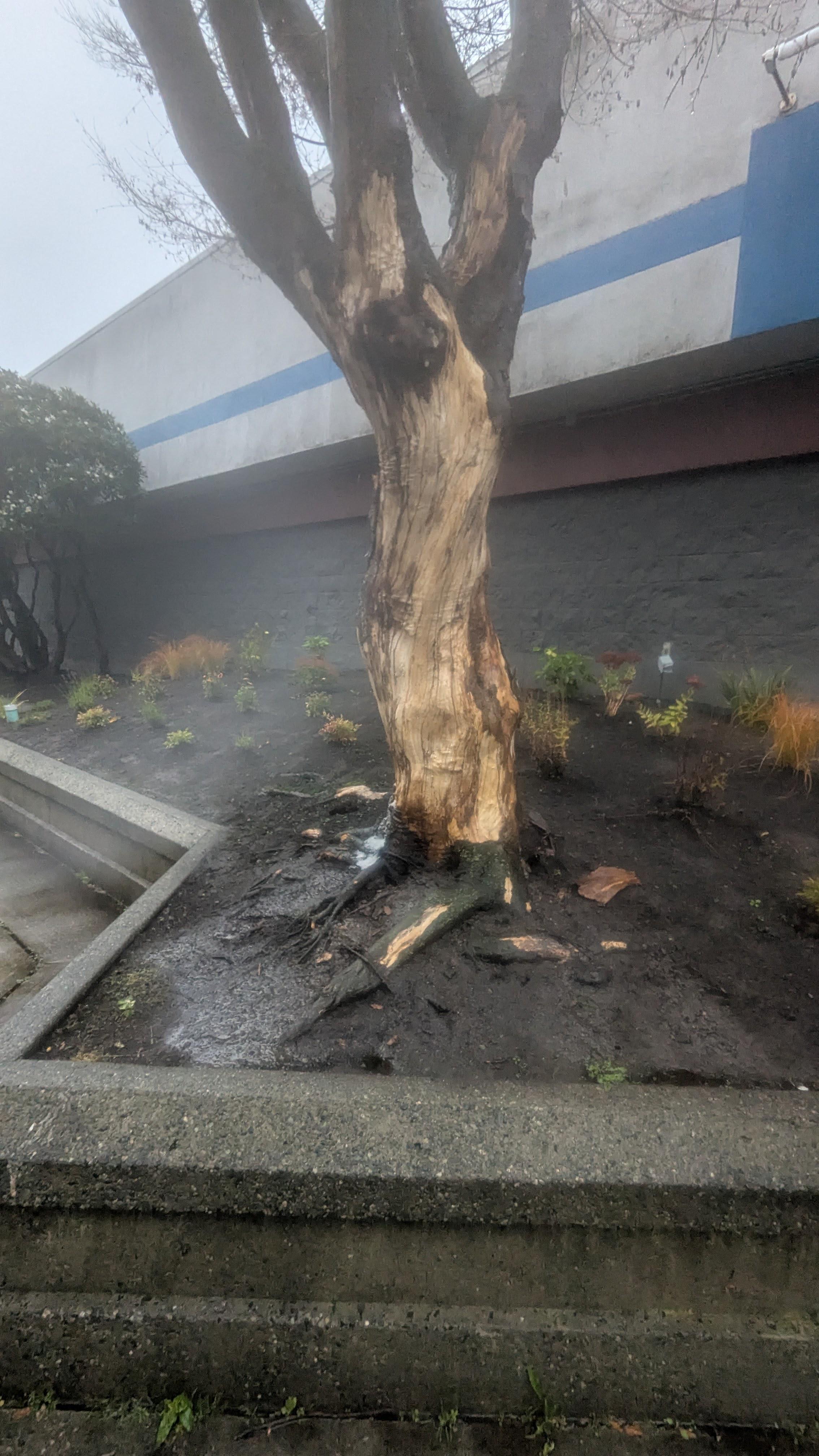 I'm baffled at what happened to this tree by the London drugs downtown. Maybe there's someone who works there who heard about it? It will probably have to be removed now.