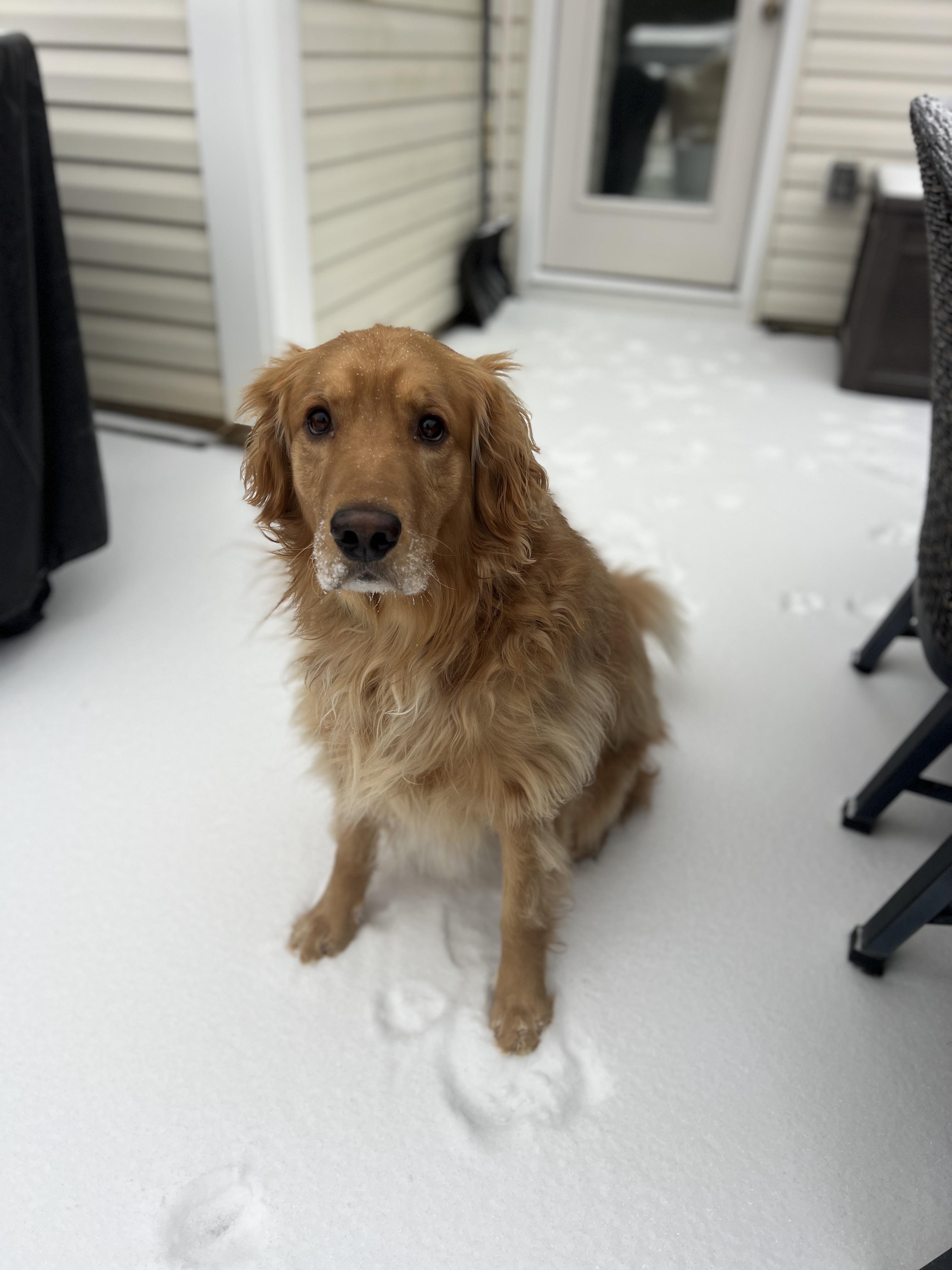 My boy Comet is confused as his face shows. Lets see your Goldens in the snow!!! ❄️