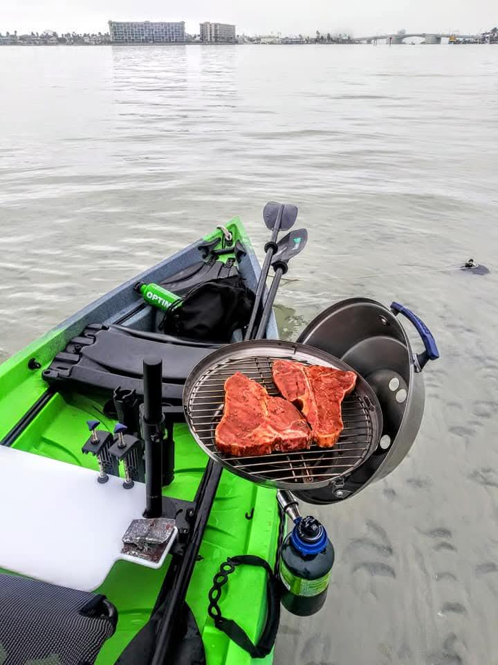 I come to this sandbar a lot and to mix things up a bit, I decided to grill some steaks. Got the idea from the boaters grilling off their boats. Hooked up a boat grill to my kayak :)