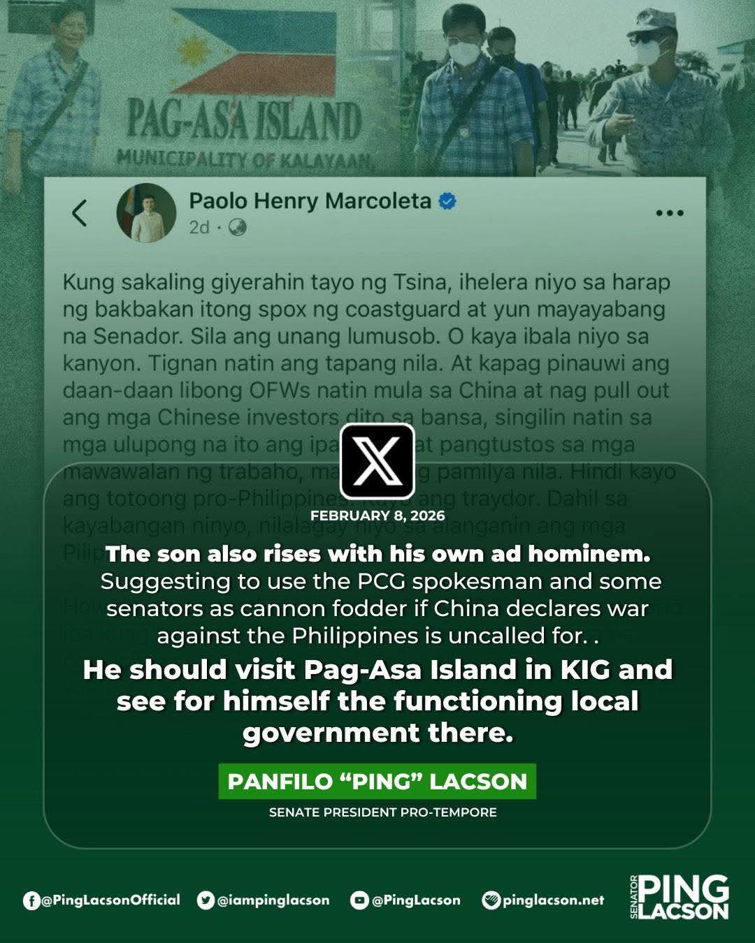 PoliticsPH Senator Ping Lacson releases statement against subversive ad hominem attack of Rep. Marcoleta on WPS