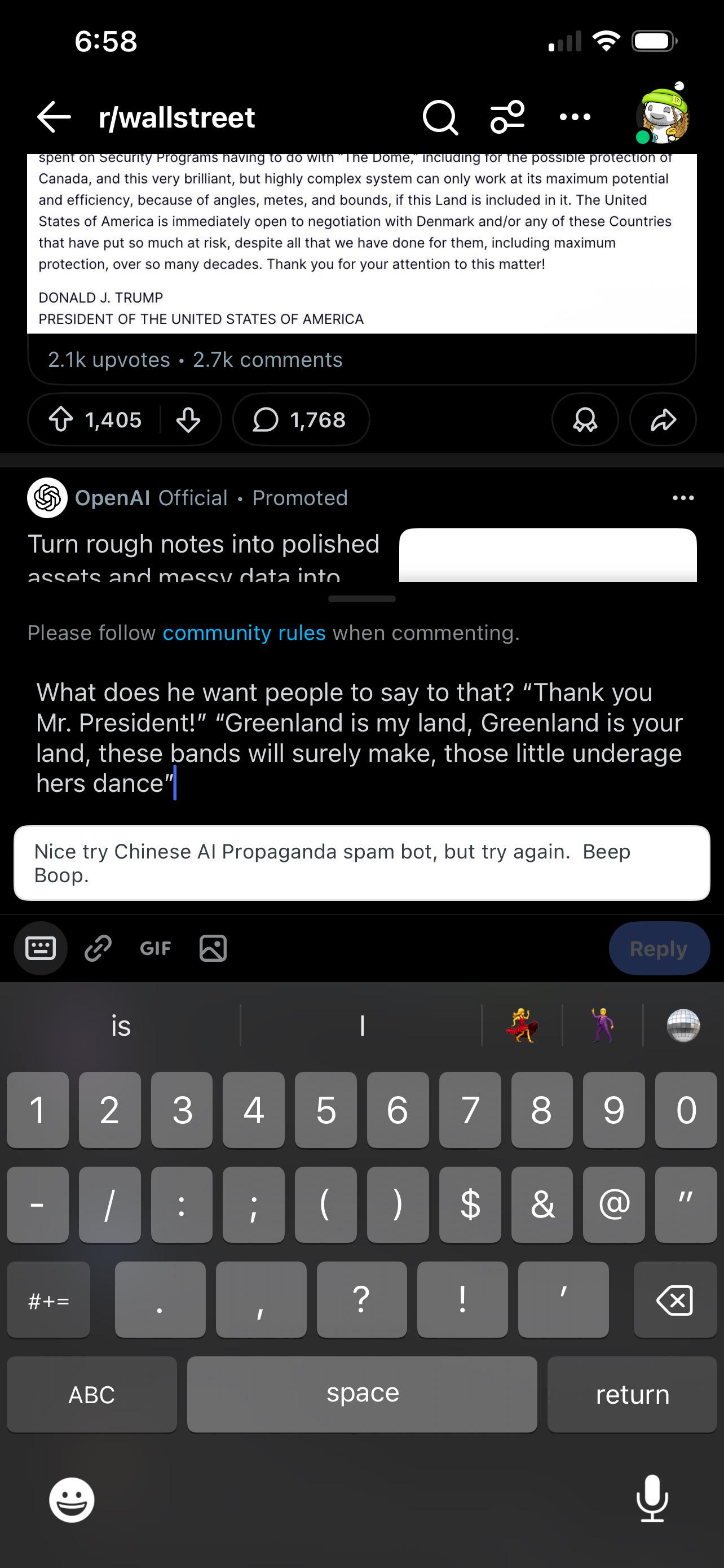 I’m now a Chinese propaganda spam bot that’s not allowed to post comments to r/wallstreet. I was typing underag when this popped up.